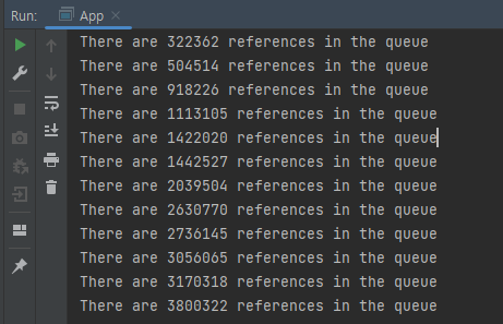 위 코드에서 해당 문제를 살펴볼 수 있다. 쓰레드가 바쁘지 않아서 GC와 Finalizer가 함께 돌아가고 있다면 항상 Reference Queue에는 0이 된다. 즉, 바로바로 처리 된다는 것을 의미한다. 그런데 이걸 가시화 하기 위해서 finalize() 메서드를 오버라이딩 한 다음 강제로 에러를 던져주면 Finalizer는 정상적으로 Reference Queue에 있는 것을 처리하는 동작을 하지 못한다. 따라서 Finalizer의 Reference Queue에는 finalize() 되지 못한 객체들이 쌓이게 된다.