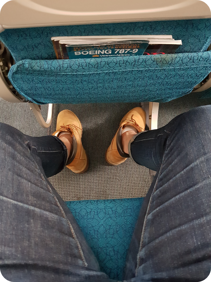 좌석 간의 넓이가 또 중요한 이슈가 될 수 있을 수 있는데요, 좌석 간의 넓이는 발을 얼마나 편하게 뻗고 있을 수 있냐를 결정하기 때문입니다. 좌석 간의 넓이는 위의 사진으로 이야기를 할 수 있을 것 같습니다. 저는 키 177cm에 체중 80kg 정도로 운동을 즐겨해서 약간 체격이 있는 체형입니다. 예전에 비엣젯 항공과 진에어를 탔을 때는 자리가 너무 좁다는 생각이 들었는데, 베트남 항공은 발을 뻗고 가기에 큰 불편함이 없었습니다. 연골 연화증으로 고통을 받으시는 분들이 타셔도, 무릎에 큰 무리는 없지 않을까라는 생각이 들었습니다.