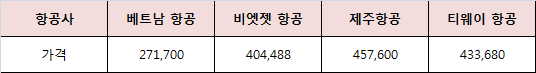 - 베트남 항공은 다른 저가항공사 대비 가격 경쟁력 있음.