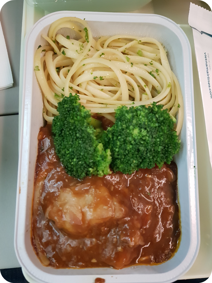 비행기 타면 빼놓을 수 없는 즐거움 중 하나는 기내식입니다. 베트남 항공의 기내식은 점심과 저녁에 따라 다르게 제공이 됩니다. 저희는 오후에 비행기를 타고 갔기 때문에 점심을 먹게 되었습니다. 점심 메뉴는 샐러드 + 치킨 스튜 + 소프트롤 + 오렌지 무스 케익을 먹었습니다 :)