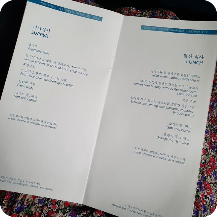제가 이용한 항공기는 인천 → 호치민을 비행하는 VN409 (B772) 기종입니다. 이코노미와 비지니스 클래스로 이루어져있고, 기체 내에는 퍼스트 클래스가 없습니다. 덕분에 비지니스 클래스 기내식이 잘 나온다는 이야기가 있습니다 :)