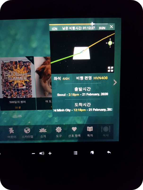 각 좌석마다 LED 화면이 비치되어있고, 그 화면을 통해 영화 같은 것들을 시청할 수 있습니다. 생각보다 최근 영화가 많이 업데이트가 되어 있었는데, 제가 탑승했던 20년 초에 기생충도 시청을 할 수 있었습니다. 저는 덕분에 좌석에 편하게 누워서 자다가, 잠이 안 오면 일어나서 기생충을 보고, 잠이 오면 다시 잠을 자는 식으로 비행기에서 시간을 보냈습니다.