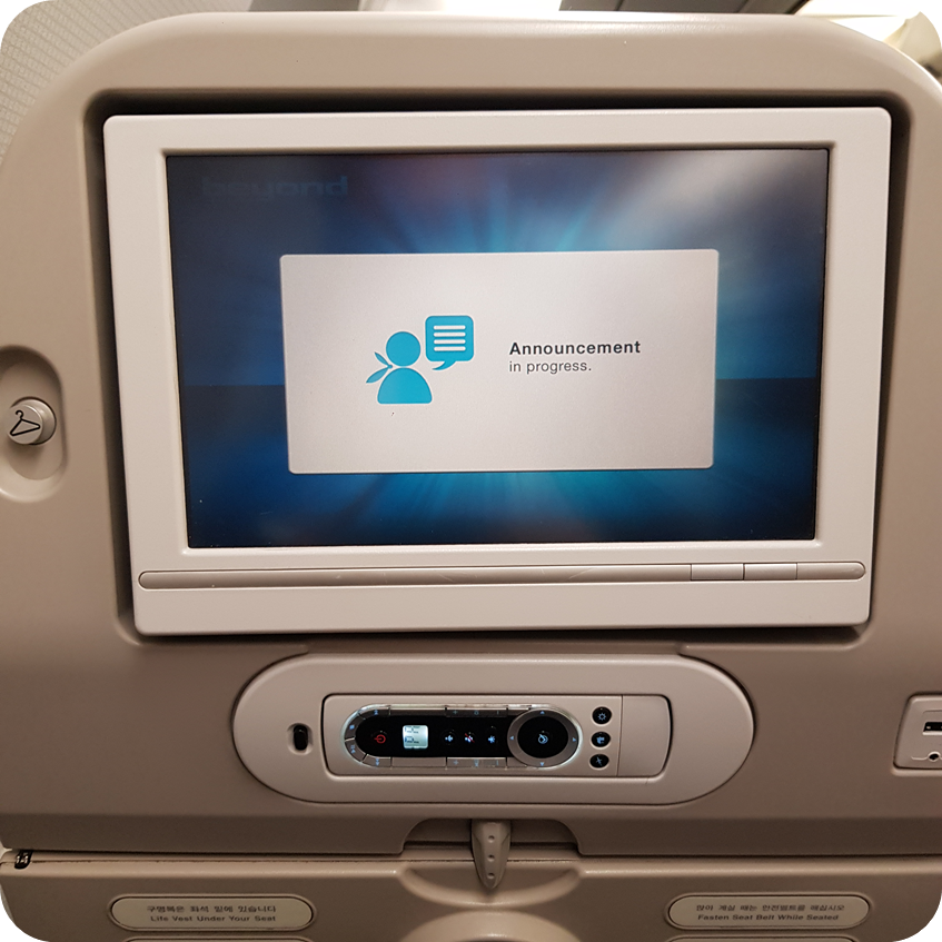 좌석마다 LED 패널이 비치되어있습니다. LED 패널을 통해서 영화 같은 것들을 볼 수 있고, 현재 비행 상황같은 것들을 확인할 수 있습니다. 그렇지만 이제 돌아오는 마지막 날에 여독이 가득해, 잠을 잔다고 저는 전혀 이용하지 않았습니다. 보시는 화면 아래에 여러가지 버튼을 통해 소리 조절도 가능하고, USB 단자가 있어 휴대폰 충전이 가능합니다