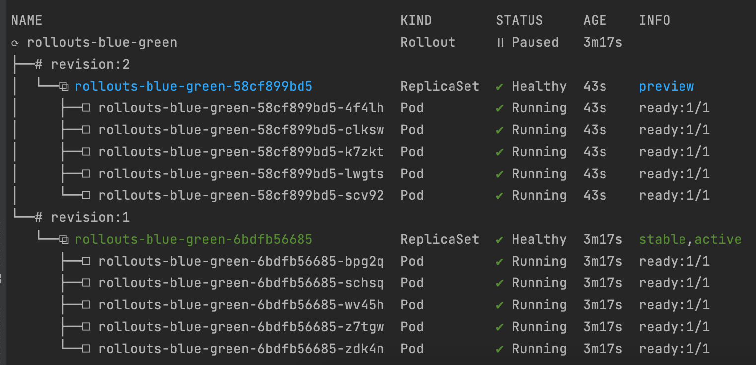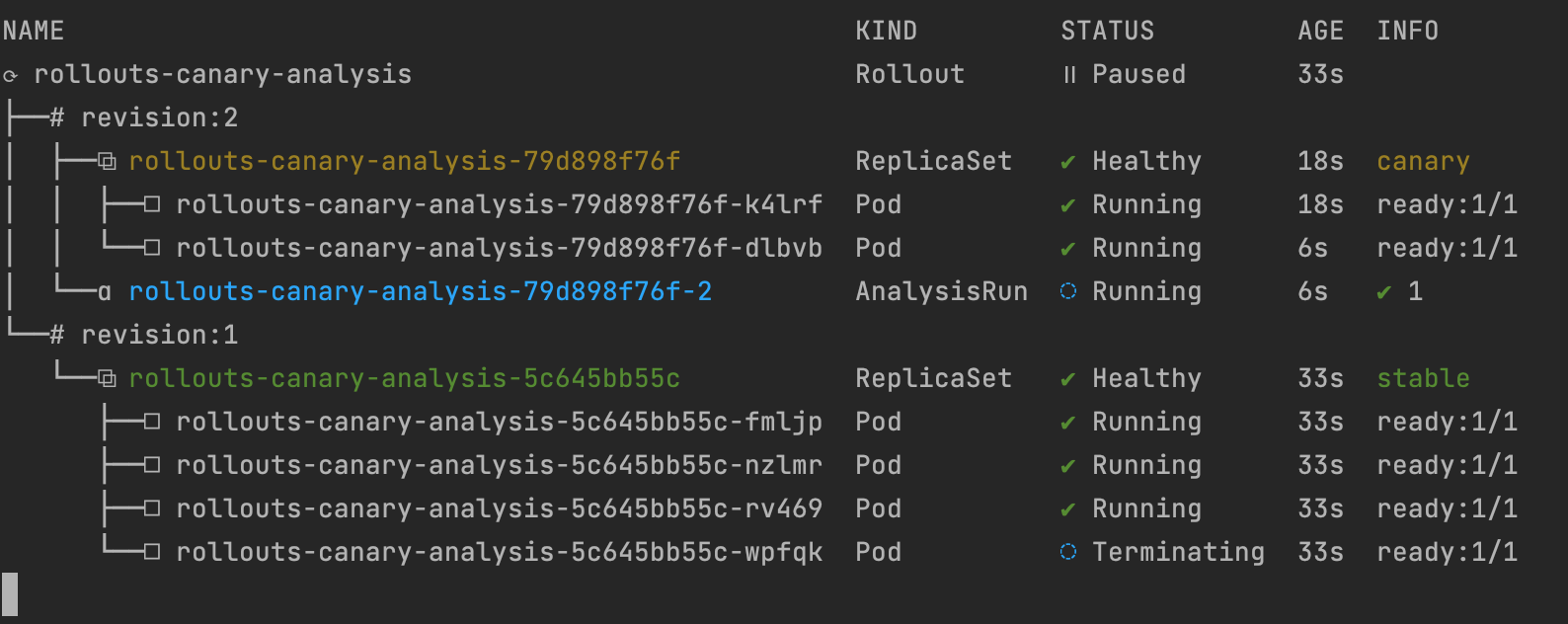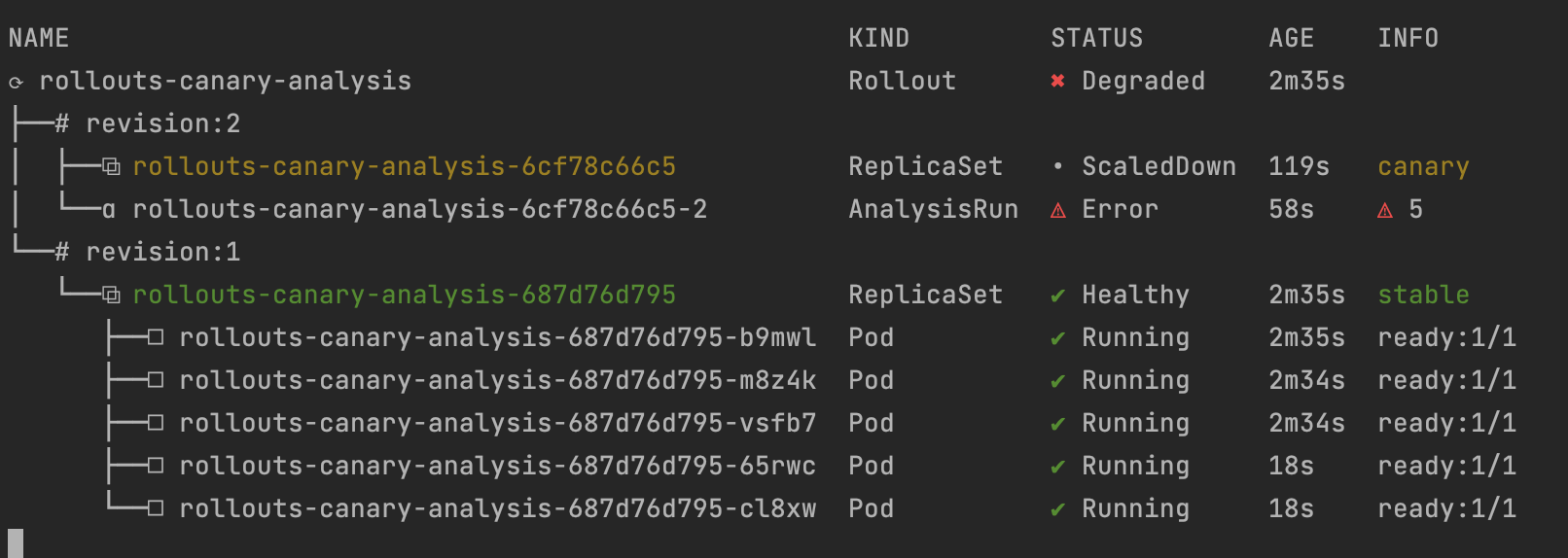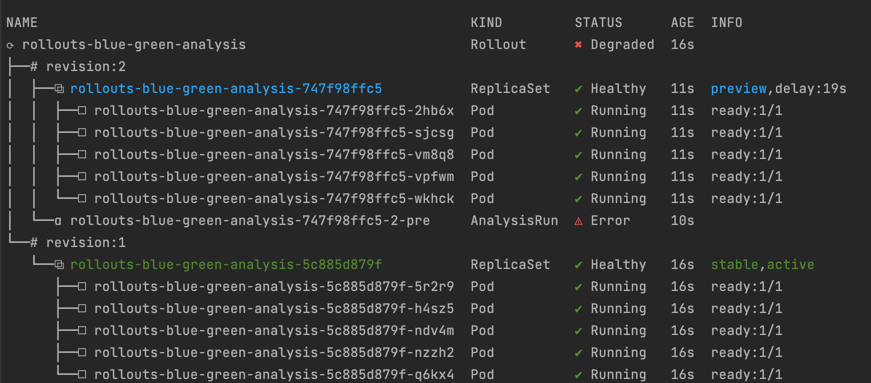 위는 prePromotionAnlaysis로 Blue/Green을 평가하고 있는 상황이다. 위에서 AnalysisRun이 임계치까지 실패하게 되면 생성된 Blue Pod들은 모두 롤백된다.