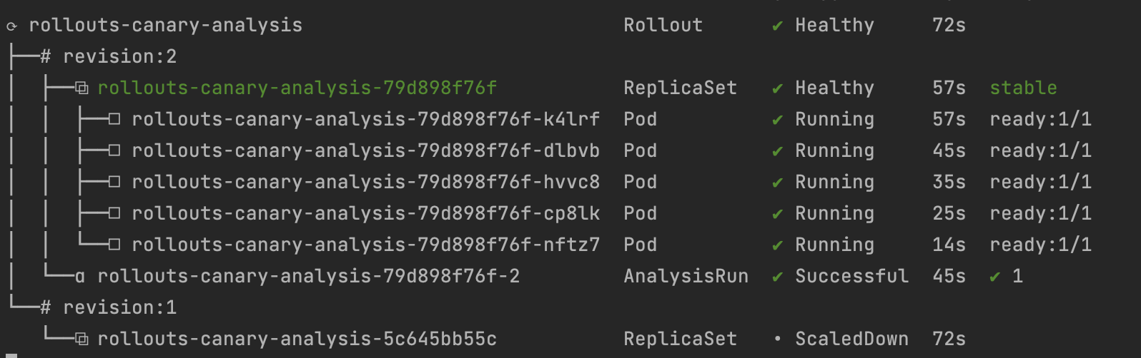 - 반면 Canary는 Count를 표기 하지 않아도 되기 때문에 단 한번만 성공해도 AnalaysisRun이 성공으로 판단됨.