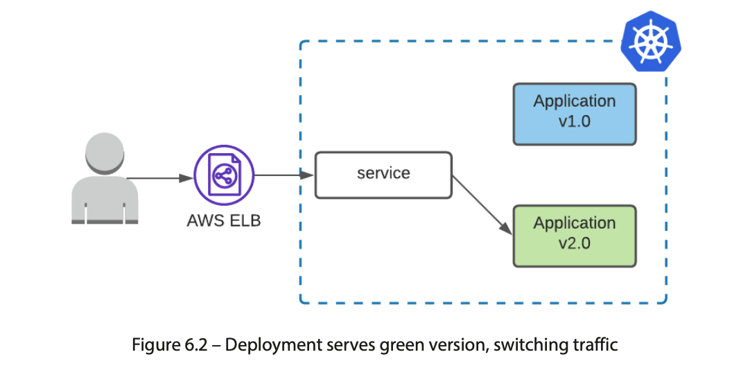 - 대부분의 엔지니어링 팀은 이 상태에서 V2가 정상적으로 동작하는지를 수동 / 자동으로 테스트를 한다. 그리고 확신을 가지면 서비스의 라벨 셀럭터를 V2로 바꾸어서 위 상태(우측 그림)로 바꾼다. 이미 V2는 떠있고 검증이 완료된 상태이기 때문에 바로 트래픽을 받을 수 있으며, 다운 타임은 0가 된다.