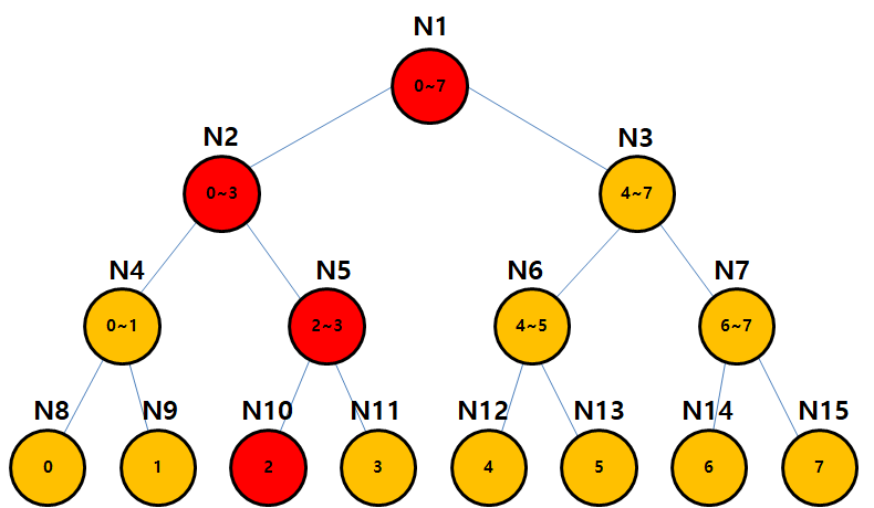 위의 이미지처럼 원하는 구간 안에 노드 구간이 포함되는 경우가 있습니다. 이 경우에도 자식 노드를 살펴볼 필요가 없습니다. 자식 노드를 더 살펴보면 아래의 이미지처럼 되는데, 보시다시피 현재 상태의 정보로 필요한 정보를 다 얻을 수 있습니다.