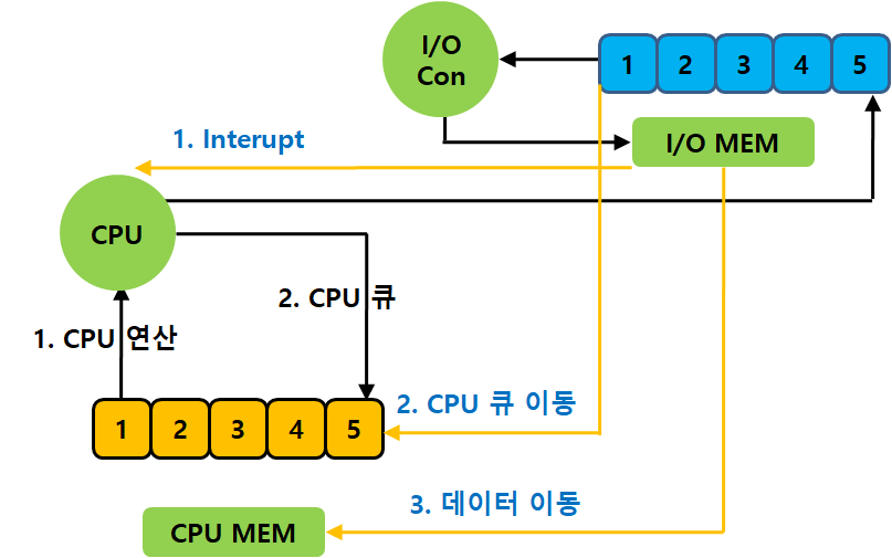 - CPU는 매 기계어 수행이 완료된 후, 인터럽트를 확인한다. 인터럽트가 확인되면, 디스크 메모리에 있는 값을 내부 메모리로 올린다. 그리고 디스크 큐에 있는 명령을 CPU 큐로 올려준다.