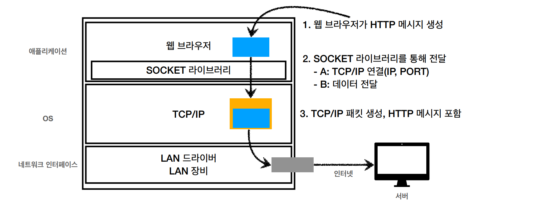 2. 생성된 HTTP 메세지는 SOKECT 라이브러리를 통해 OS로 전달된다. 이 때, TCP/IP를 알고 있으니 이 정보를 SOCKET 라이브러리 정보를 이용해 3 Way Handshake로 연결한다.