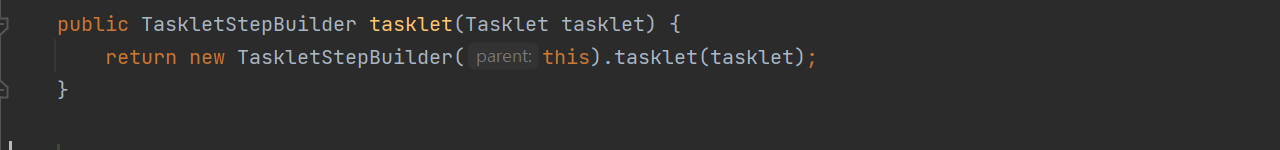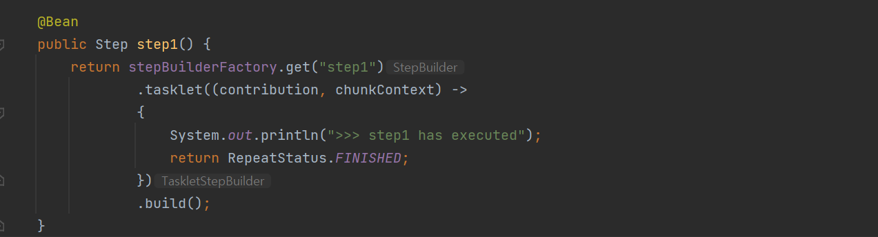 TaskLetStep은 다음과 같이 stepBuilderFactory로 부터 StepBuilder를 받은 후, StepBuilder 객체에 taskLet() 메서드를 사용하면서 만들 수 있다.