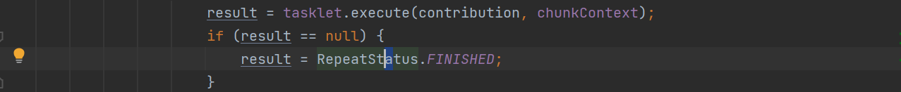 TaskLet.Execute()를 통해 TaskletStep이 가지는 TaskLet 객체의 비즈니스 로직이 수행되는 것을 확인할 수 있다. 결과는 result에 저장되는데, result에 null값이 전달될 경우 RepeatStatus가 Finished로 설정되어 반복되지 않는 것을 확인할 수 있다.