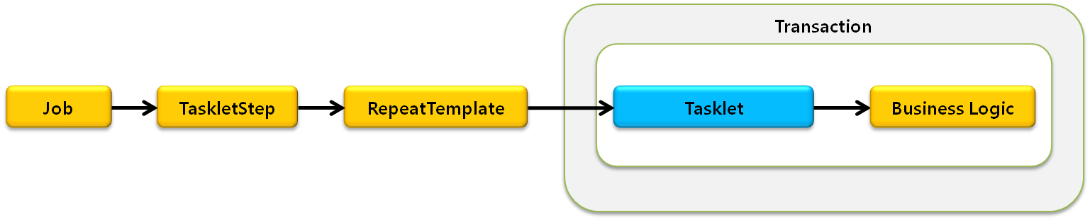 TaskletStep은 다음과 같이 동작한다. 위에 코드 설명을 클래스로 나누어보면 다음과 같다고 이해하면 될 것 같다. 결국 SimpleJob이 Step을 실행시키고, 이 Step은 내부적으로 RepeatTemplate을 이용해서 TaskLet을 실행시킨다. 가만히 놔두면 무한 반복이 되는데 Exception이 터지거나, RepeatStatus가 Finished / null로 설정될 경우 Step이 종료된다. 또한, Transaction을 가지고 있기 때문에 Transaction을 처리해줄 필요가 없다.
