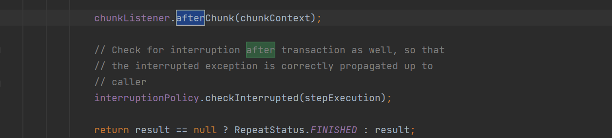 TaskLetStep 객체의 실행이 끝나면, 다시 doInChunkContext 메서드로 돌아온다. 여기서 ChunkListner.afterChunk를 통해 다시 한번 필요한 일을 하는 것을 확인할 수 있다.
