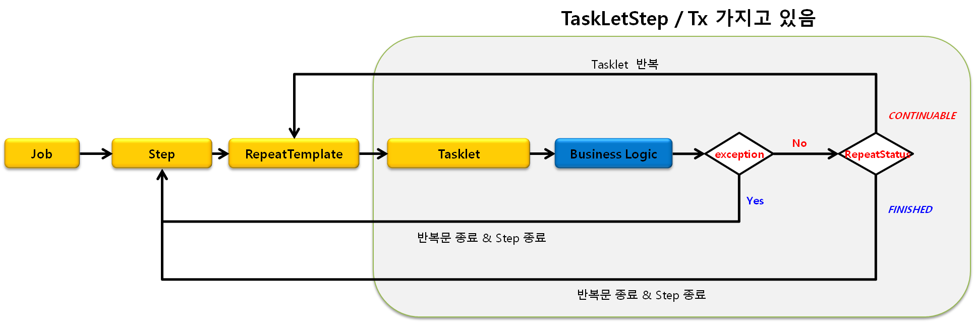- RepeatTemplate의 값을 확인해서 RepeatStatus가 Continuable인 경우 Tasklet을 수행한다.