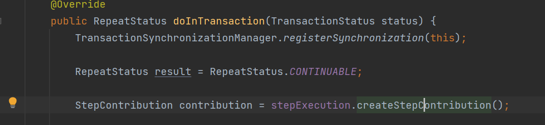 다시 TaskLetSTep의 doInTransaction 메서드로 들어오게 된다. 여기서 RepeatStatus를 Contiunable로 설정하는 것을 볼 수 있다. 이 말은 RepeatStatus.Finished를 설정하지 않으면, 항상 무한 반복한다는 뜻이다.