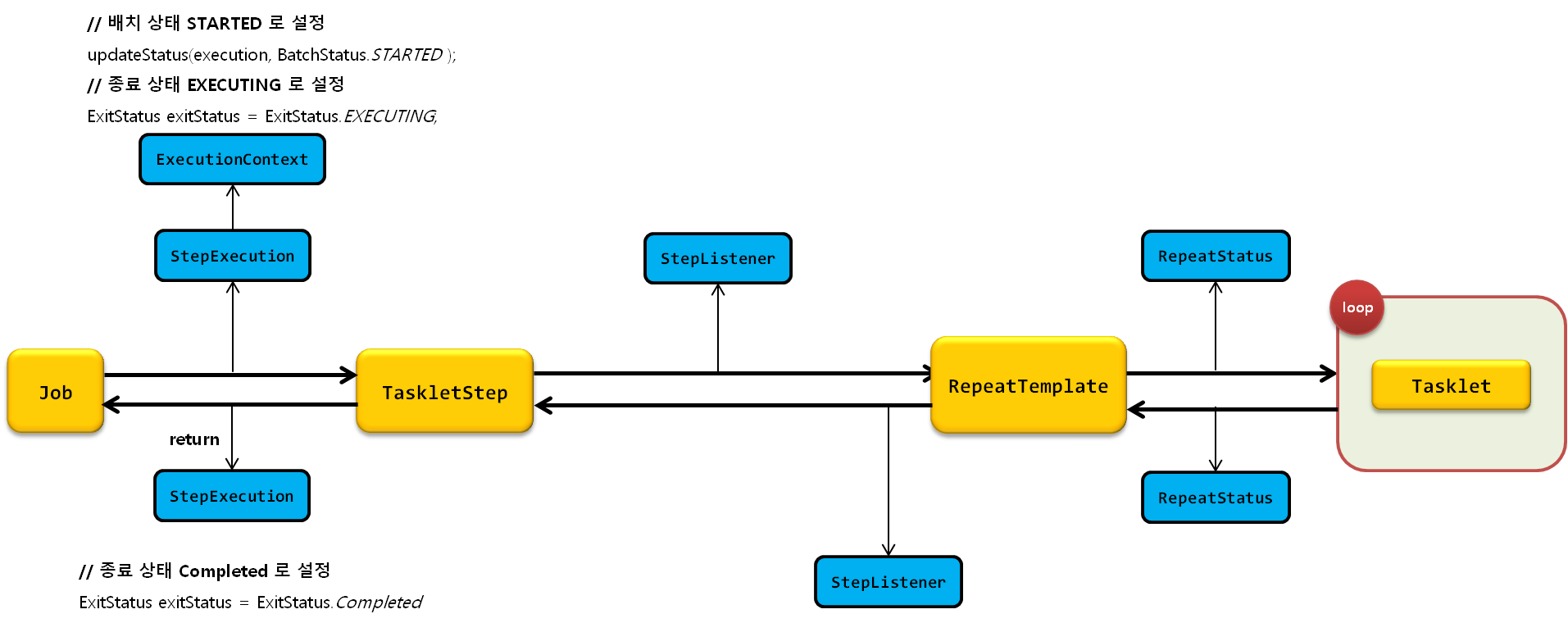 TaskLetStep은 내부적으로 TaskLet을 가지는 객체다. TaskLet은 실제 일을 하는 객체이며, 쓰레드의 Runnable 인터페이스와 유사한 역할을 한다. TaskLetStep은 또 내부적으로 RepetableTemplate 객체를 가지는데, 이 객체를 통해 TaskLet을 기본적으로는 무한대로 반복하는 형태의 동작을 한다. TaskLetStep은 TaskLet 기반도 가능하지만, Chunk를 기반으로 가능하다.