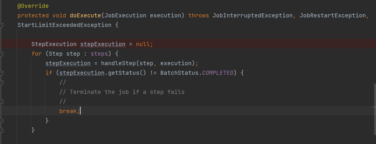 TaskLetStep은 SimpleJobLauncher를 실행하면서, SimpleJob이 실행시켜준다. SimpleJob의 doExecute에서 for문을 돌면서 각 Step을 실행시켜준다. 이 때, handleStep 메서드에 Step / Execution 정보를 넘겨주면서 실행된다.