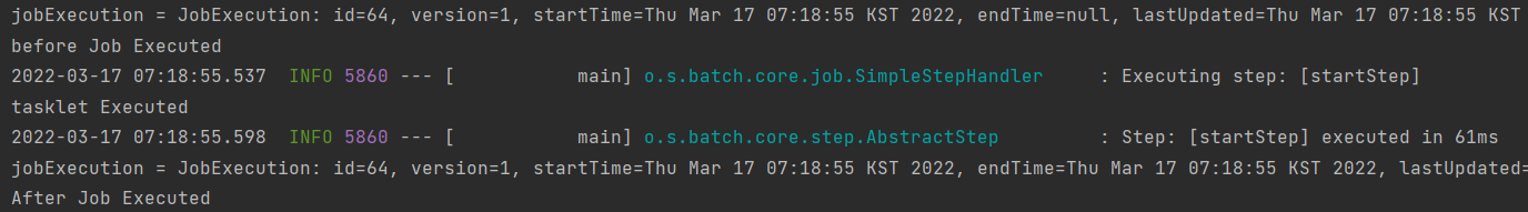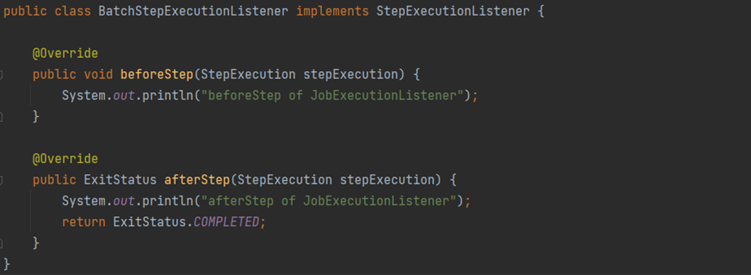 또한 주의해서 봐둬야 할 부분은 자동으로 파라메터 바인딩을 해준다는 것이다. 위의 클래스는 철저하게 Custom Class인데도 불구하고 JobExecution 같은 인자를 받을 수 있다. 당연한 이야기겠지만 JobListener이기 때문에 JobExecution을 받을 수 있는거고, StepExecution이 받을 수 없다. 따라서 어떤 어노테이션을 쓰느냐에 따라 DI 되는 파라메터가 달라지는 것을 인지해야한다.