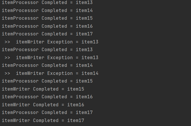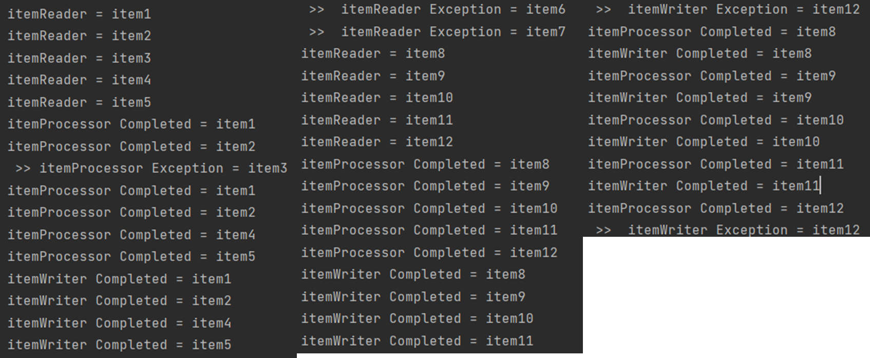 - 1~5까지가 첫번째 청크다. 1~5까지 실행하던 도중 ItemProcessor에서 "Item3"을 진행하다가 Exception이 발생했다. 따라서 ItemReader에 캐시된 Input Chunk를 다시 가져와 Input Chunk의 처음부터 ItemProcessor 처리를 시작한다. 그리고 Item3을 Skip해준다. 그리고 Writer까지 정상적으로 진행된 것을 확인했다.