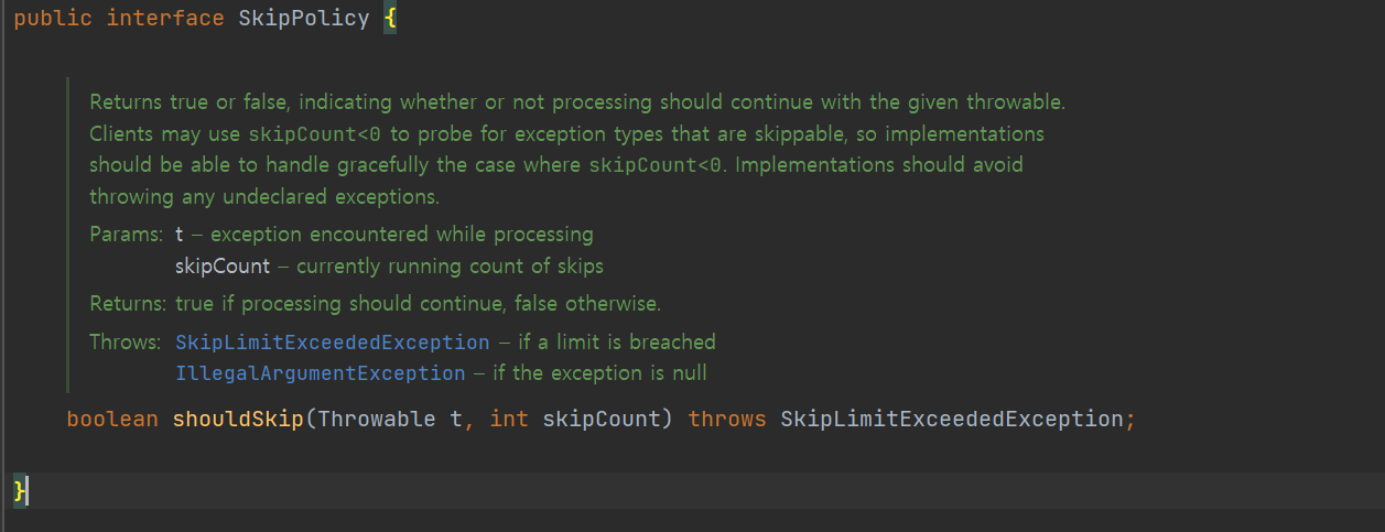 SkipPolicy 인터페이스는 shouldSkip 메서드를 가진다. 이 메서드는 boolean 값을 가지는데, 현재 Exception에 대해서 skipcount를 넘겨주고 skip 가능한지를 True / False로 판단해서 넘겨주는 식으로 동작한다. 따라서 사용자가 구현할 때는 위의 내용을 참고해서 구현하면 된다.