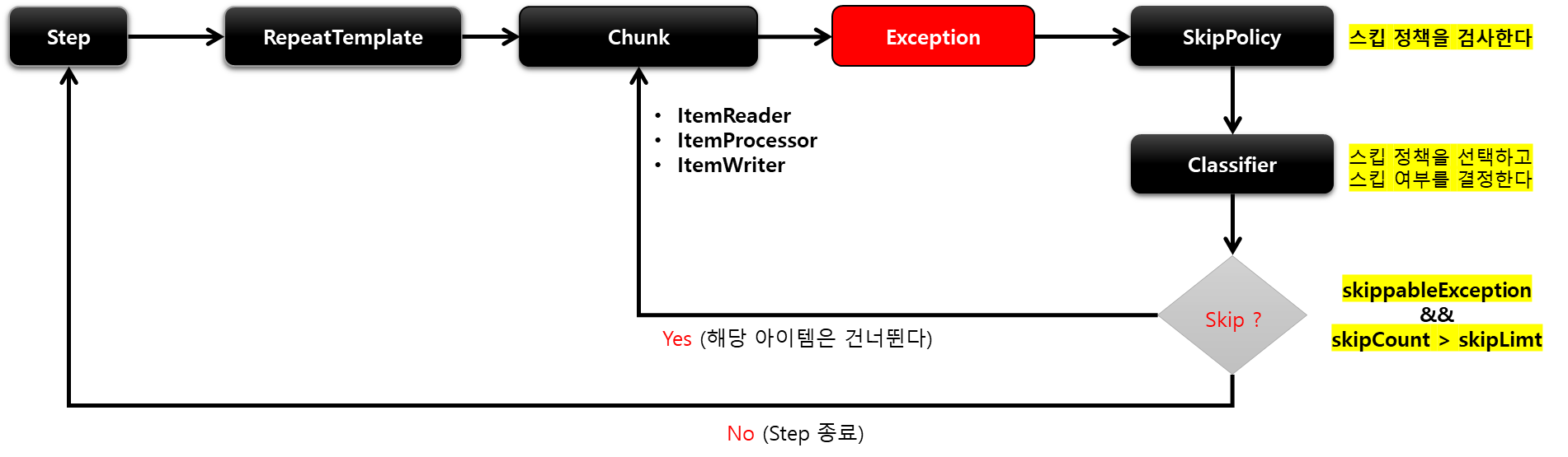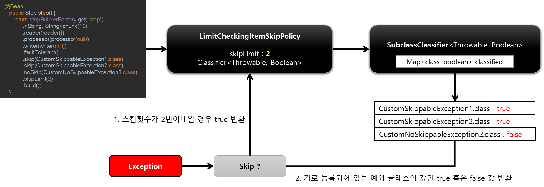 - ExceptionClassifierSkipPolicy : 예외 대상을 분류하여 Skip 여부 결정. (어떤 예외는 Skip, 어떤 예외는 No Skip 분류)