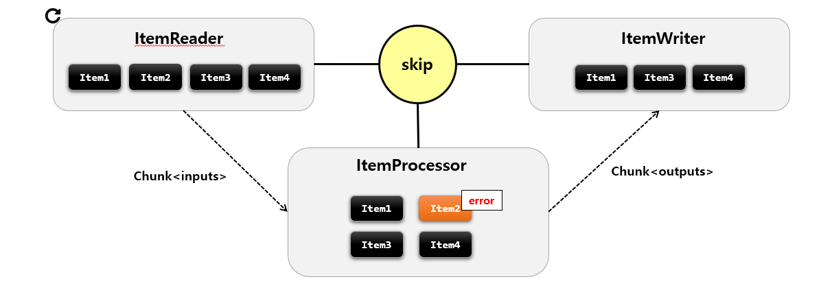 예를 들어 Item2에서 Exception이 발생하면, 다시 Input Chunk를 받아와서 Item1을 읽고, Item2를 건너뛰고 Item3을 읽는 방식으로 처리된다.
