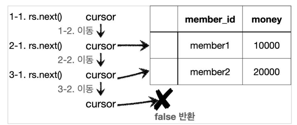 - ResultSet은 "select member_id, money"로 지정을 하면, 'member_id → money' 컬럼 순서대로 결과가 들어간다.