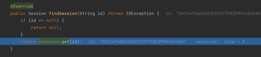 findSession을 하면 Map에 sessionId에 해당되는 세션을 찾아서 Return한다. 그렇지만 아직까진 아무런 세션이 없기 때문에 Null값이 리턴된다.