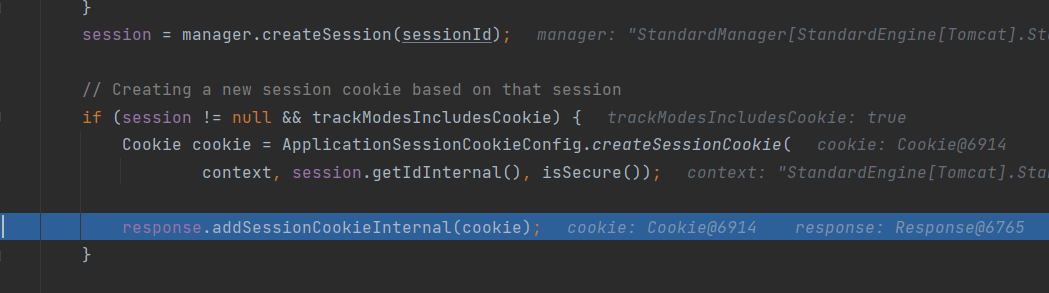 위의 코드에서 좀 더 아래로 내려와보면 세션을 생성하는 부분도 존재한다. manager.createSession(sessionId)로 세션을 생성한다. 앞서 이야기한 것처럼 처음에 접속할 때 받았던 SessionId를 바탕으로 세션을 생성하는 것이다. 나중에 세션이 만들어지고 나면 response에 현재 세션 쿠키 값을 저장한다는 것도 같이 볼 수 있다. (addSessionCookieInternal)