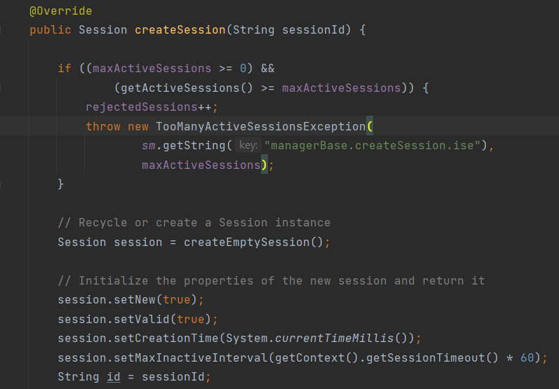- 만약에 세션이 없고, 새롭게 세션을 생성하라는 정책인 경우 manager.createSession을 통해서 세션을 만든다. 이 때, 빈 세션을 만들고 그곳에 세션 ID를 설정해준다. 그리고 그 세션을 ConcurretnHashMap에 추가해준 뒤에 반납해준다.