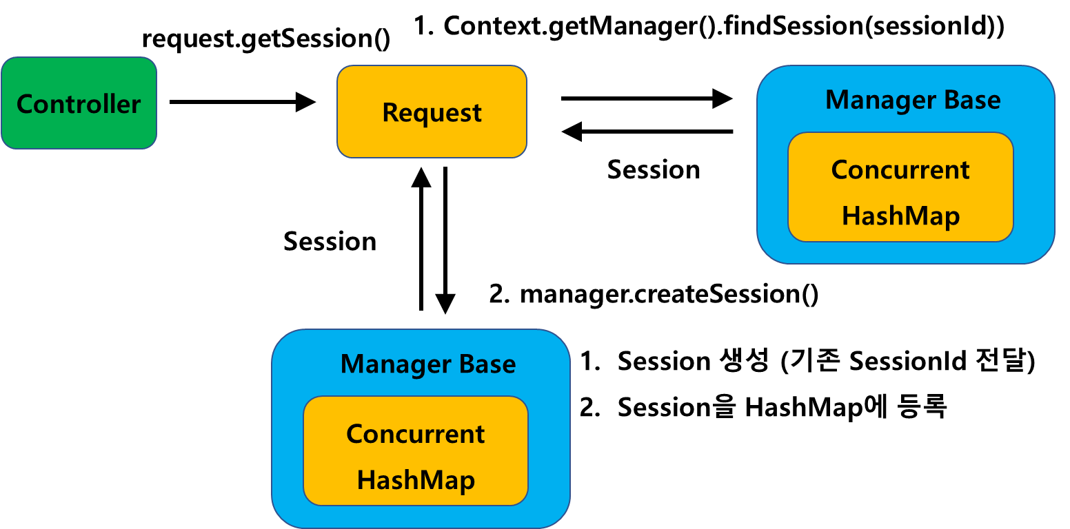 - Request 객체는 서블릿 컨테이너 내부의 Manager를 불러와서, Manager의 ConcurrentHashMap에 세션이 저장되어있는지를 확인한다. 여기서 찾아지면 Session을 Return 해준다.