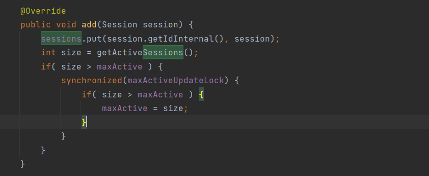 setId 메서드를 디버그로 타고 오면 ManagerBase 클래스의 add()로 넘어오게 된다. add는 Session을 받아서 Sessions에서 값을 추가하는 것을 볼 수 있다. 즉, 새로운 세션을 생성하는 것은 다음과 같은 순서대로 진행된다는 것이다